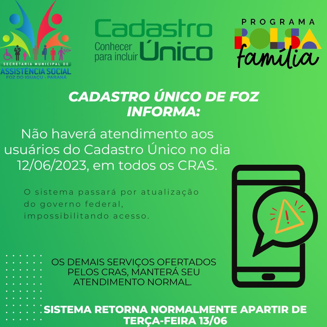 A Secretaria Municipal de Assistência Social informa que na próxima segunda-feira (12) não haverá atendimento aos usuários do Cadastro Único em todos os Centros de Referência de Assistência Social (CRAS).