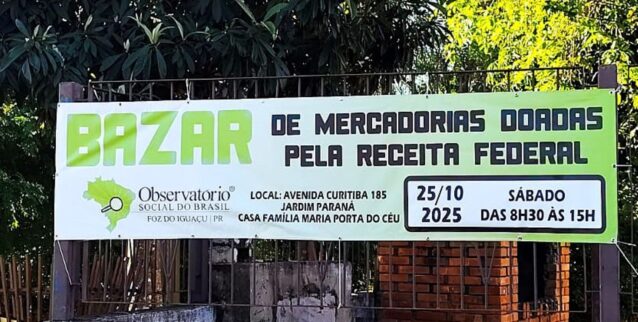 O Observatório Social de Foz do Iguaçu (OSB-FI) realiza no próximo sábado, 25 de outubro, a partir das 8h30, um grande bazar com mercadorias importadas doadas pela Receita Federal. A ação será na Casa Família Maria Porta do Céu, localizada no Jardim Paraná, região da Vila A.