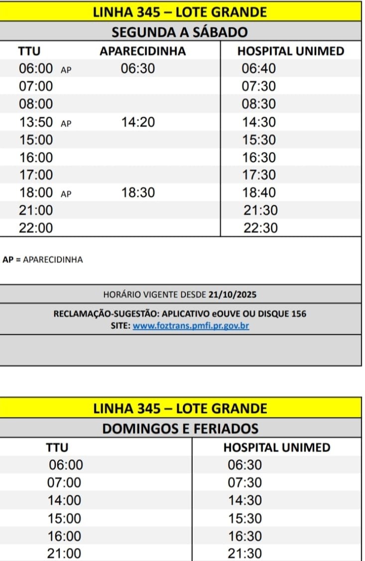 A tabela de horários da Linha 345 – Lote Grande já está disponível para consulta no aplicativo Único Foztrans, que pode ser baixado gratuitamente em dispositivos móveis.
