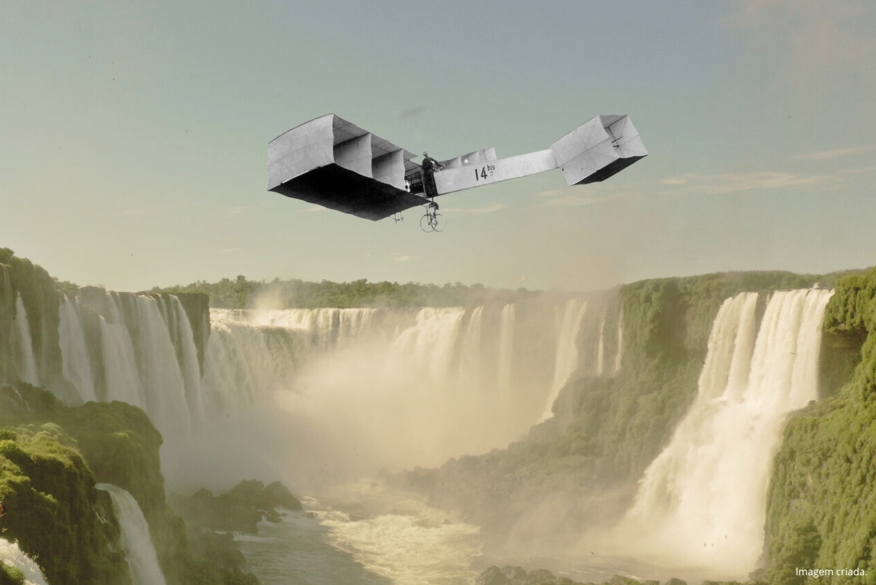 E para finalizar, a imagem deste texto foi uma colagem feita por mim, uma mistura de tempos e sonhos, do que poderia ter sido, aos meus olhos e sem a real ordem cronológica, o 14-Bis sobrevoando as Cataratas do Iguaçu, com Santos Dumont observando em seu relógio de pulso os minutos imortalizados no costurar das histórias da Grande História.