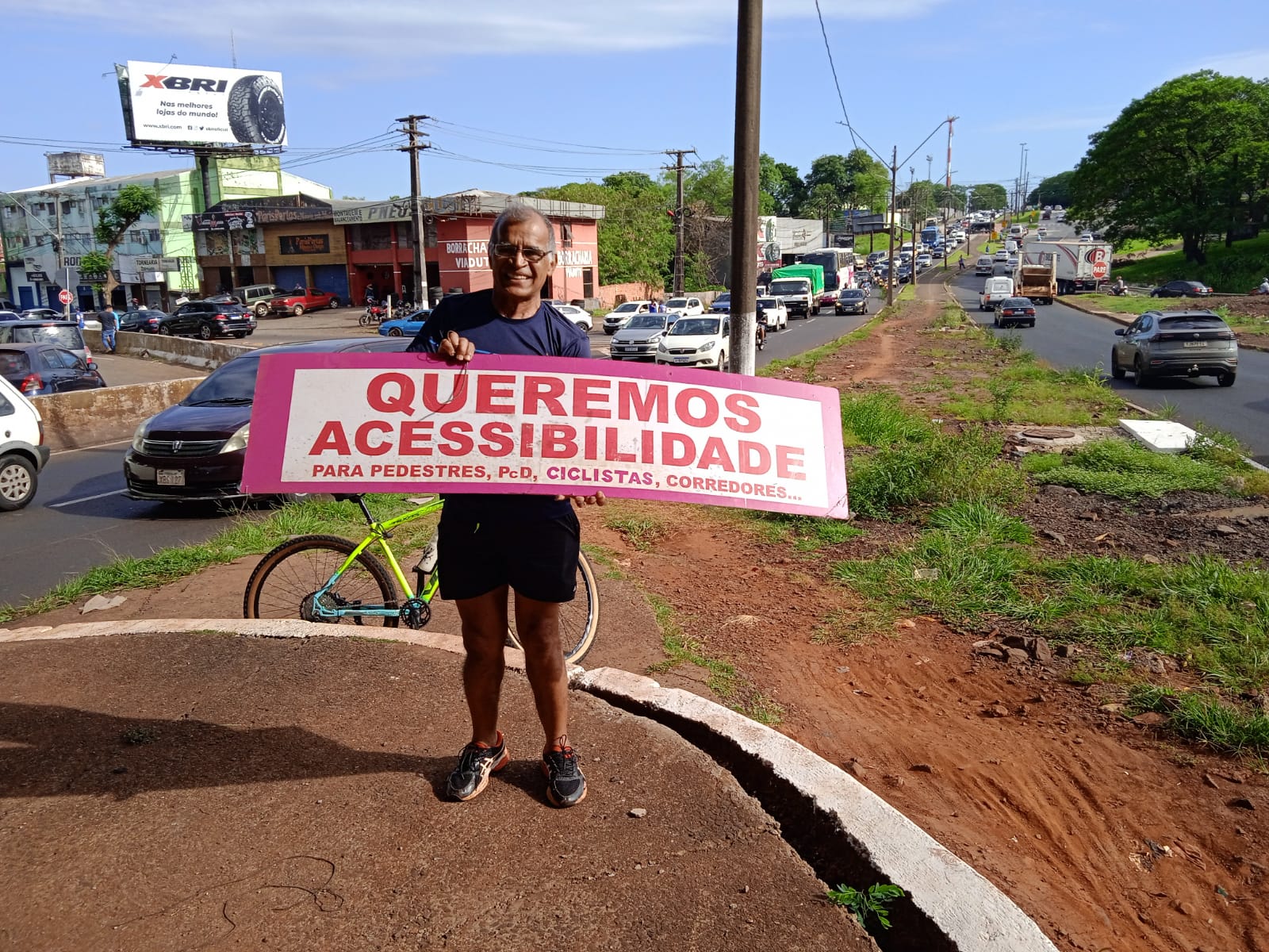 “Queremos acessibilidade para pedestres, PCDs, ciclistas e corredores.” É o que diz a faixa carregada pelo ciclista João Carvalho Tavares, que há meses realiza um protesto solitário embaixo do viaduto da Avenida Juscelino Kubitschek (JK), na ligação com a BR-277, em Foz do Iguaçu.