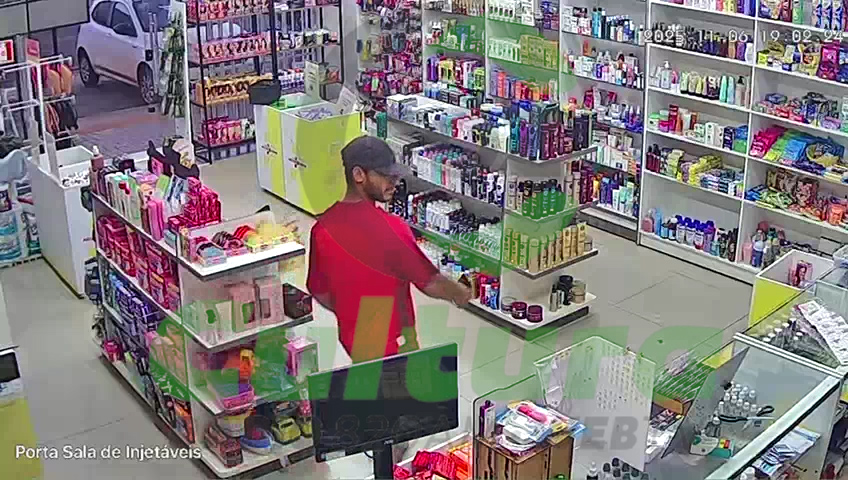 As câmeras de segurança de uma farmácia localizada na região de Três Lagoas registraram o momento em que um homem anuncia um assalto no estabelecimento. As imagens mostram o movimento tranquilo no local até que o suspeito, usando boné e blusa vermelha, entra na farmácia e se dirige ao balcão de atendimento.