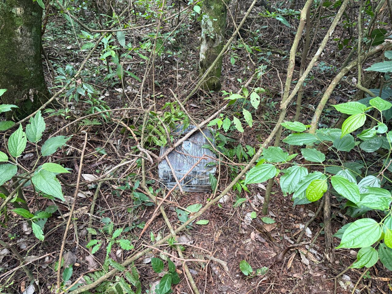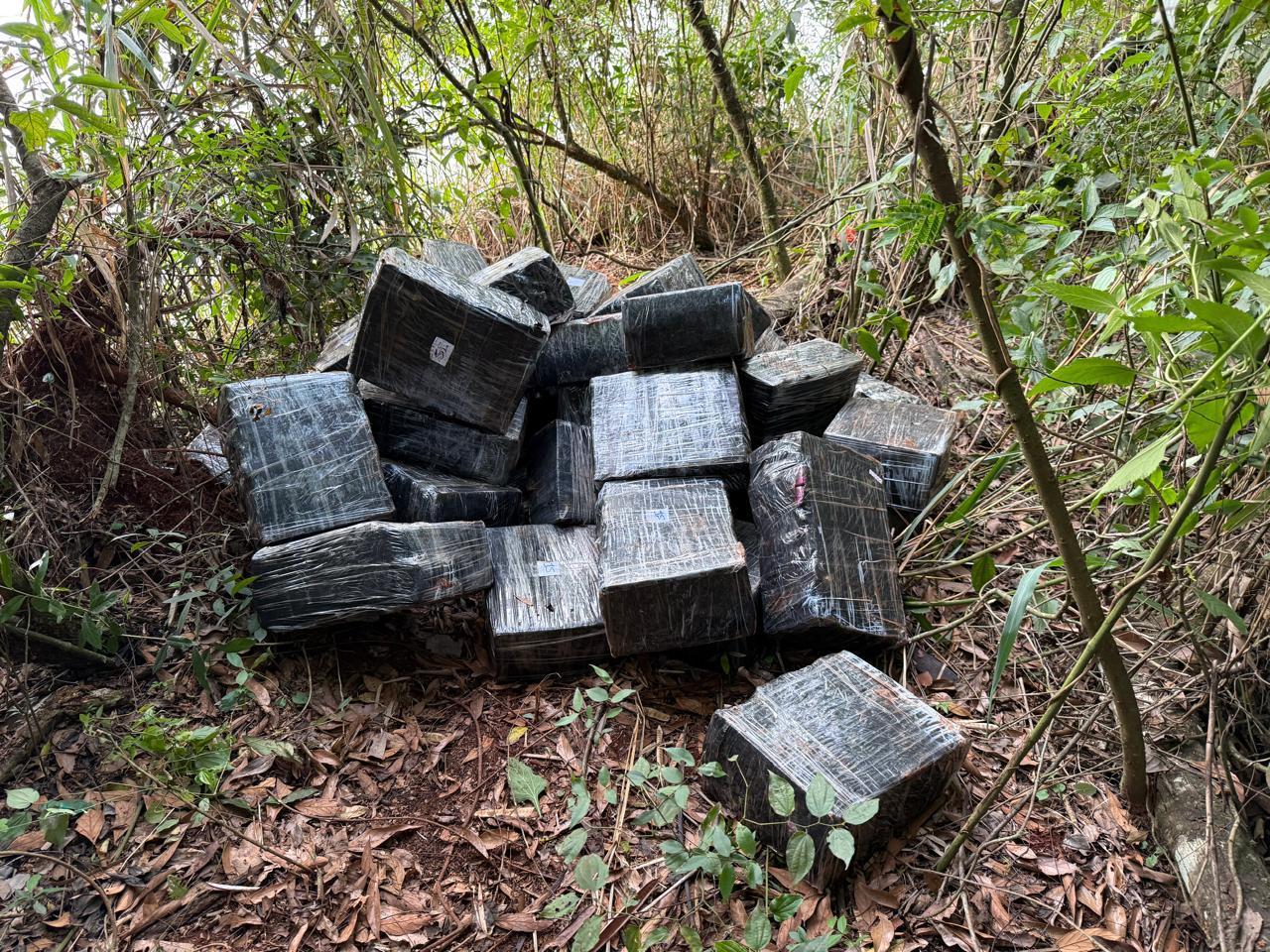 Ao se deslocarem até o ponto de atracação, os policiais encontraram uma trilha que ligava a via vicinal ao lago. No local, foram localizados vários volumes empilhados em meio à mata, contendo tabletes de maconha prensada. Os agentes também avistaram indivíduos transportando fardos da margem; eles fugiram para a mata ao perceber a aproximação.