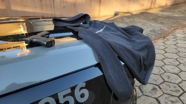 Policiais do grupo Choque foram acionados para dar apoio à ocorrência e encontraram três homens dentro da residência onde o carro estava guardado. Dois deles foram reconhecidos pelas vítimas — incluindo o suspeito que aparece nas imagens usando tornozeleira eletrônica.