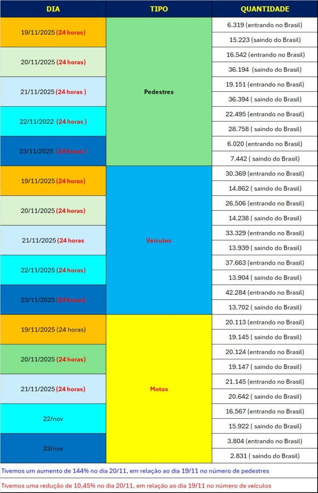 No dia 19/11, 6.319 pedestres entraram no Brasil, enquanto 15.223 saíram. No dia 20/11, houve um aumento de 144% na entrada, totalizando 16.542 pessoas, e 36.194 na saída. Entre 21 e 22/11, o fluxo permaneceu elevado, com 19.151 e 22.495 entradas, respectivamente. No dia 23/11, observou-se queda, com 6.020 pedestres entrando e 7.442 saindo.