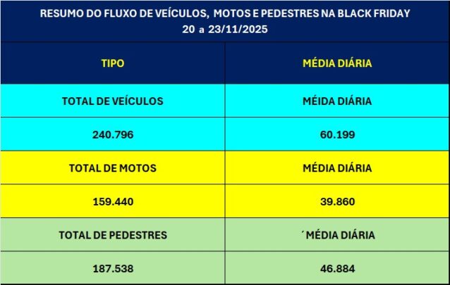 Entre 21 e 23/11, o fluxo de entrada aumentou gradualmente, atingindo 42.284 veículos no último dia, enquanto a saída se manteve próxima de 13 a 14 mil veículos diários.
