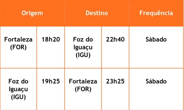 A partir de Foz do Iguaçu, Fortaleza passa a ser o quarto destino doméstico operado pela GOL, junto a Congonhas, Guarulhos e RIOgaleão. Os voos serão operados com aeronaves Boeing 737, incluindo o moderno e mais sustentável 737 MAX 8, com capacidade para 186 passageiros.