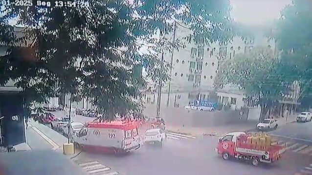 No vídeo, o automóvel segue pela Rua Xavier da Silva quando um caminhão de gás aparece à frente. O motorista freia, mas, ao lado dele, vem a ambulância do SAMU, cujo condutor não consegue evitar o impacto. Com a força da batida, a viatura sobe na calçada e atinge parte da fachada de uma loja.