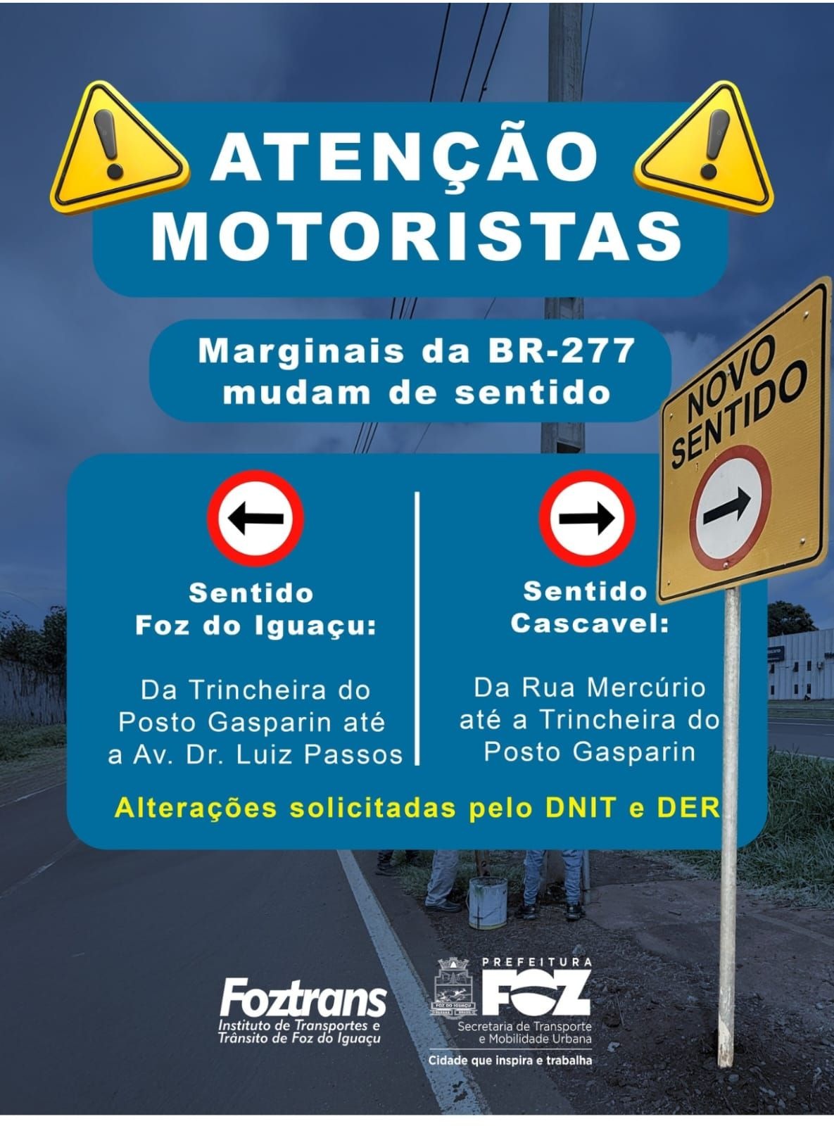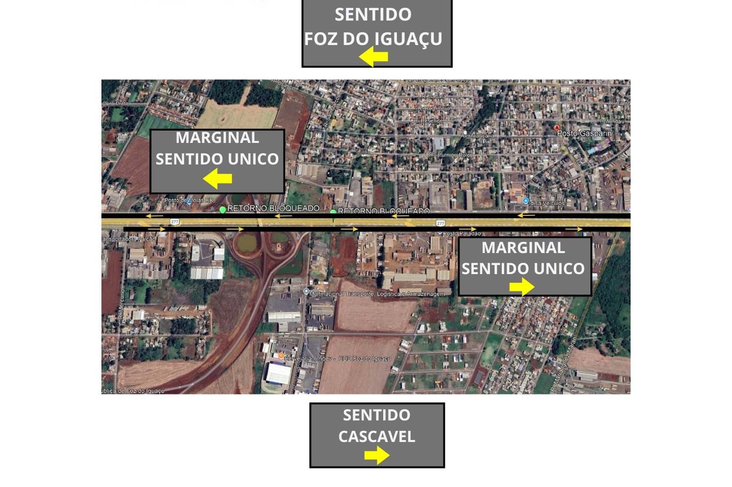 De acordo com o comunicado oficial, no sentido Foz do Iguaçu, o novo sentido passa a operar da trincheira do posto Gasparin até a avenida Dr. Luiz Passos. Já no sentido Cascavel, o tráfego em mão única ocorre da rua Mercúrio até a trincheira do posto Gasparin, conforme a nova sinalização instalada no local.