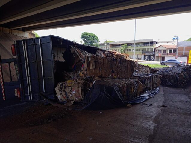 Um caminhão carregado com papel reciclado tombou no fim da manhã desta quarta-feira (7) embaixo do viaduto da Avenida Costa e Silva, em Foz do Iguaçu, no ponto onde a BR-277 passa sobre a via. Apesar do susto e dos transtornos no trânsito, ninguém ficou ferido.