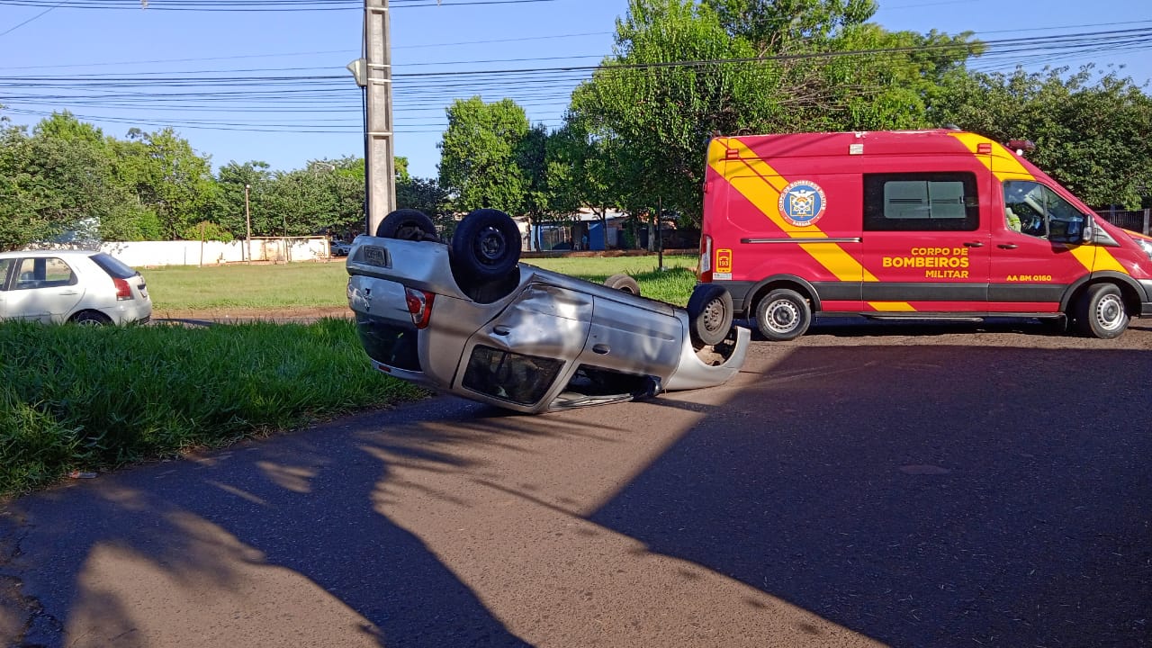 Um carro capotou na manhã desta quarta-feira (23) no cruzamento das ruas Araucária e Salvador, no Jardim Ana Cristina, região conhecida como Vila Brás, em Foz do Iguaçu.