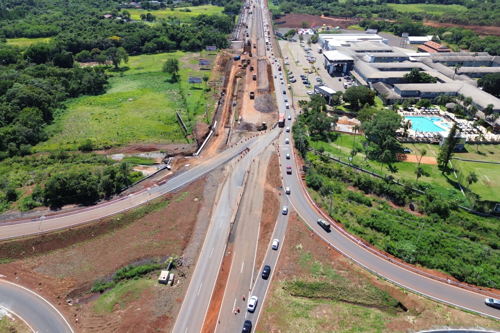 Também seguem em andamento os serviços de pavimentação das novas vias marginais, implantação do sistema de drenagem de águas, galerias e passa-faunas, além da sinalização horizontal e vertical e da instalação de dispositivos de segurança viária. As intervenções abrangem um trecho de aproximadamente 8,7 quilômetros, entre o portal de entrada do Parque Nacional do Iguaçu e o trevo de acesso à Argentina.