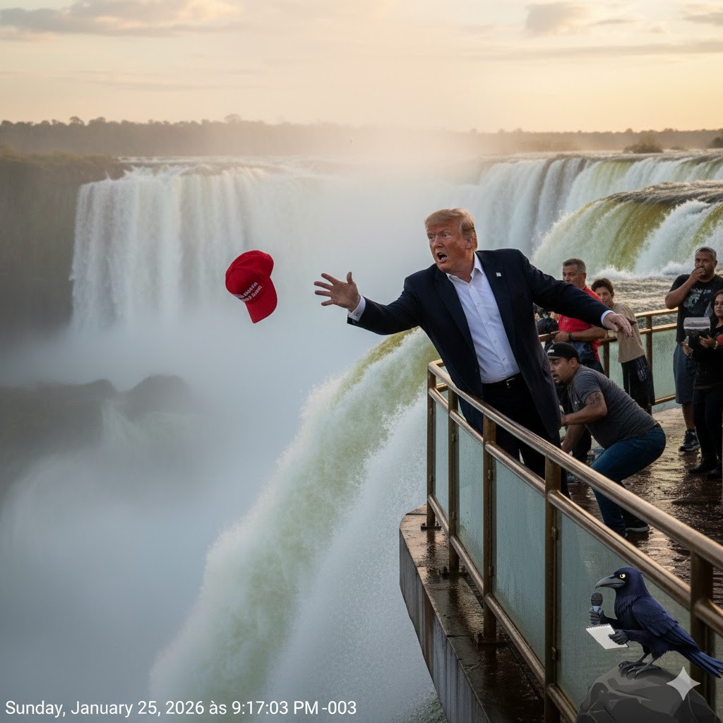 A fofoca diplomática da semana é impagável. Dizem que Donald Trump, ao ver uma foto das nossas Cataratas, exclamou: “Poor Niagara!”. Um assessor, mais lido que o chefe, soprou no ouvido dele que a frase já tinha dona: Eleanor Roosevelt, lá nos anos 50. Trump, que não gosta de ser segundo em nada, emendou: “É um lugar bonito, espero ir lá me encontrar com meu novo amigo, o Lula”. Imagina a cena: os dois discutindo o Mercosul no mirante ao lado da Garganta do Diabo!
