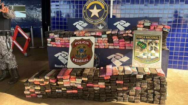 Durante a ação, servidores da Receita Federal interceptaram uma caminhonete de placa paraguaia que transportava 269,5 kg de substância análoga à maconha. O veículo foi retido após fiscalização na aduana.