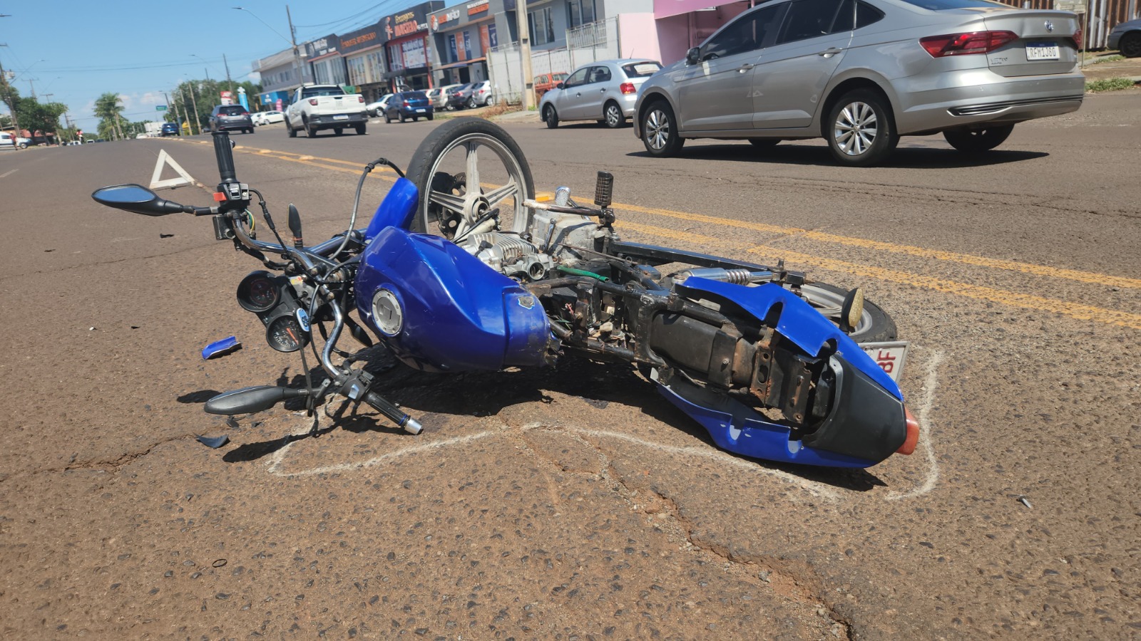 Com o impacto da batida, a motocicleta ficou praticamente destruída. Já o carro teve a lateral bastante danificada, principalmente a porta traseira do lado do carona.