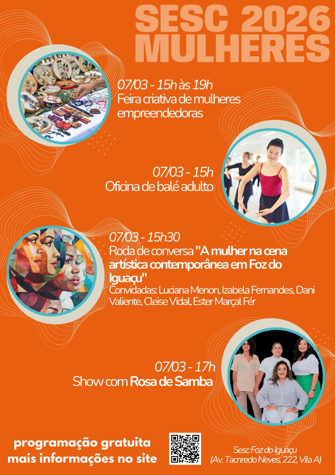No dia 7 de março, a programação concentra uma série de atividades. Das 15h às 19h, ocorre a Feira Criativa de Mulheres Empreendedoras, destacando iniciativas locais. Às 15h, o público poderá participar da oficina de balé adulto e, às 15h30, da roda de conversa “A mulher na cena artística contemporânea em Foz do Iguaçu”, com a participação de artistas convidadas da cidade. Encerrando a agenda do dia, às 17h, haverá show com o grupo Rosa de Samba.