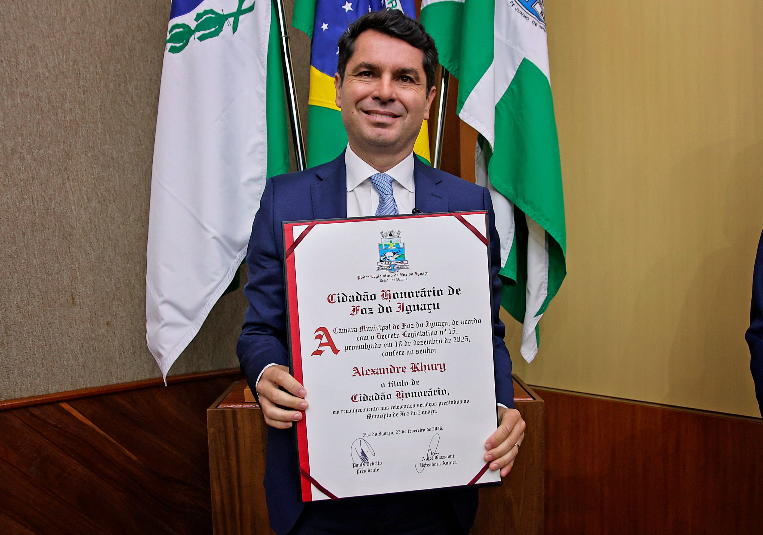 O presidente da Assembleia Legislativa do Paraná, Alexandre Curi, recebeu nesta sexta-feira (27) o título de Cidadão Honorário de Foz do Iguaçu, concedido pela Câmara Municipal. A honraria reconhece a trajetória pública do parlamentar e sua atuação em defesa dos municípios paranaenses, com ênfase em projetos e articulações voltadas à cidade da fronteira.