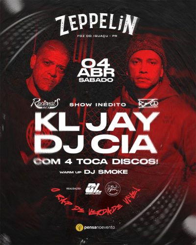 Os DJs KL Jay e DJ CIA se apresentam no dia 4 de abril de 2026, no Zeppelin Old Bar, em Foz do Iguaçu. O evento integra a programação da produtora BeatLoko e terá início às 21h, com previsão de encerramento às 5h.