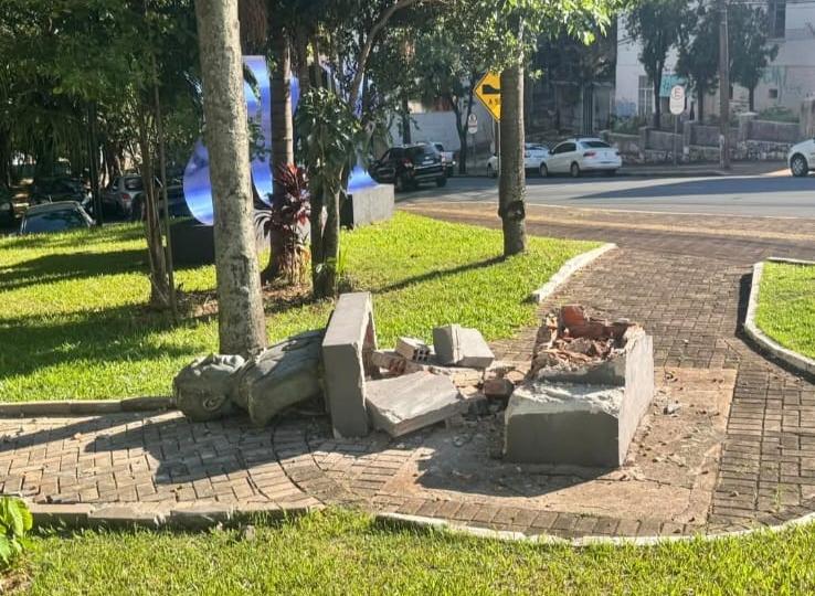 O busto do ex-presidente Getúlio Vargas foi encontrado caído e parcialmente destruído na praça que leva seu nome, em Foz do Iguaçu. A cena chamou a atenção de moradores e pedestres nas primeiras horas do dia, com partes da estrutura espalhadas pela calçada.