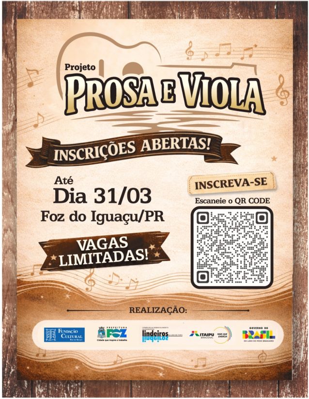 Estão abertas as inscrições para o Projeto Prosa e Viola, iniciativa voltada à formação musical de crianças e adolescentes de 7 a 15 anos nos municípios lindeiros ao Lago de Itaipu. O prazo para se inscrever foi prorrogado e segue agora até o dia 13 de abril, com vagas gratuitas e limitadas.