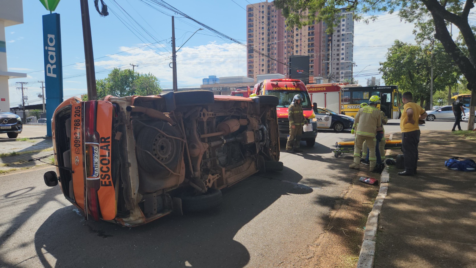 Já a van escolar teve os maiores prejuízos. Com a força da batida, o veículo girou na pista e capotou, parando alguns metros à frente do ponto de impacto.